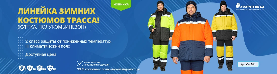 В интернет-магазине спецодежды Прабо предлагаются новые утеплённые рабочие костюмы «Трасса» от общепроизводственных загрязнений повышенной видимости по выгодным ценам. Серия костюмов «Трасса» представлена в трёх трендовых цветах: лимонный-чёрный; оранжевый-тёмно-синий; жёлтый-чёрный.